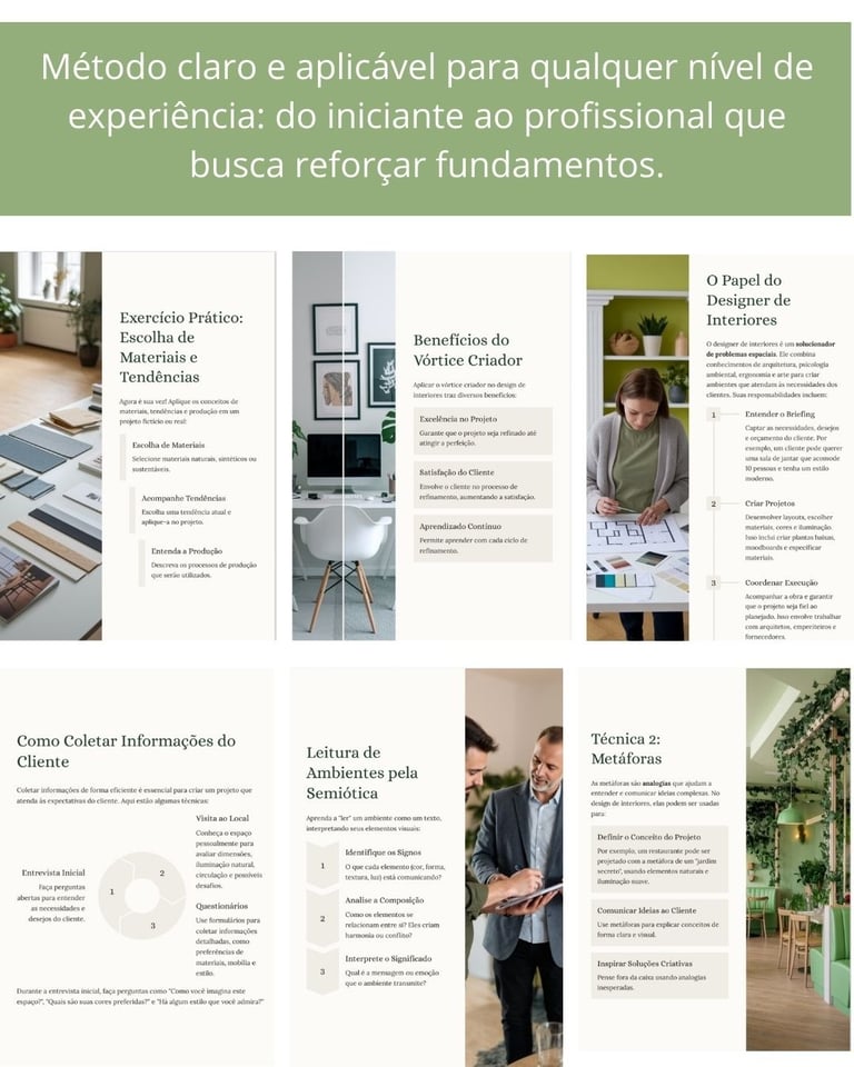 Esta apostila é diferente de um simples catálogo de ideias. Ela é um convite para fortalecer e orientar seu olhar natural. Com ela, você terá acesso às ferramentas mentais e técnicas que permitem validar e executar suas ideias com segurança, tomando decisões conscientes em cada etapa. É onde a sua criatividade encontra a estrutura para se tornar um projeto que emociona pela beleza e funcionalidade.